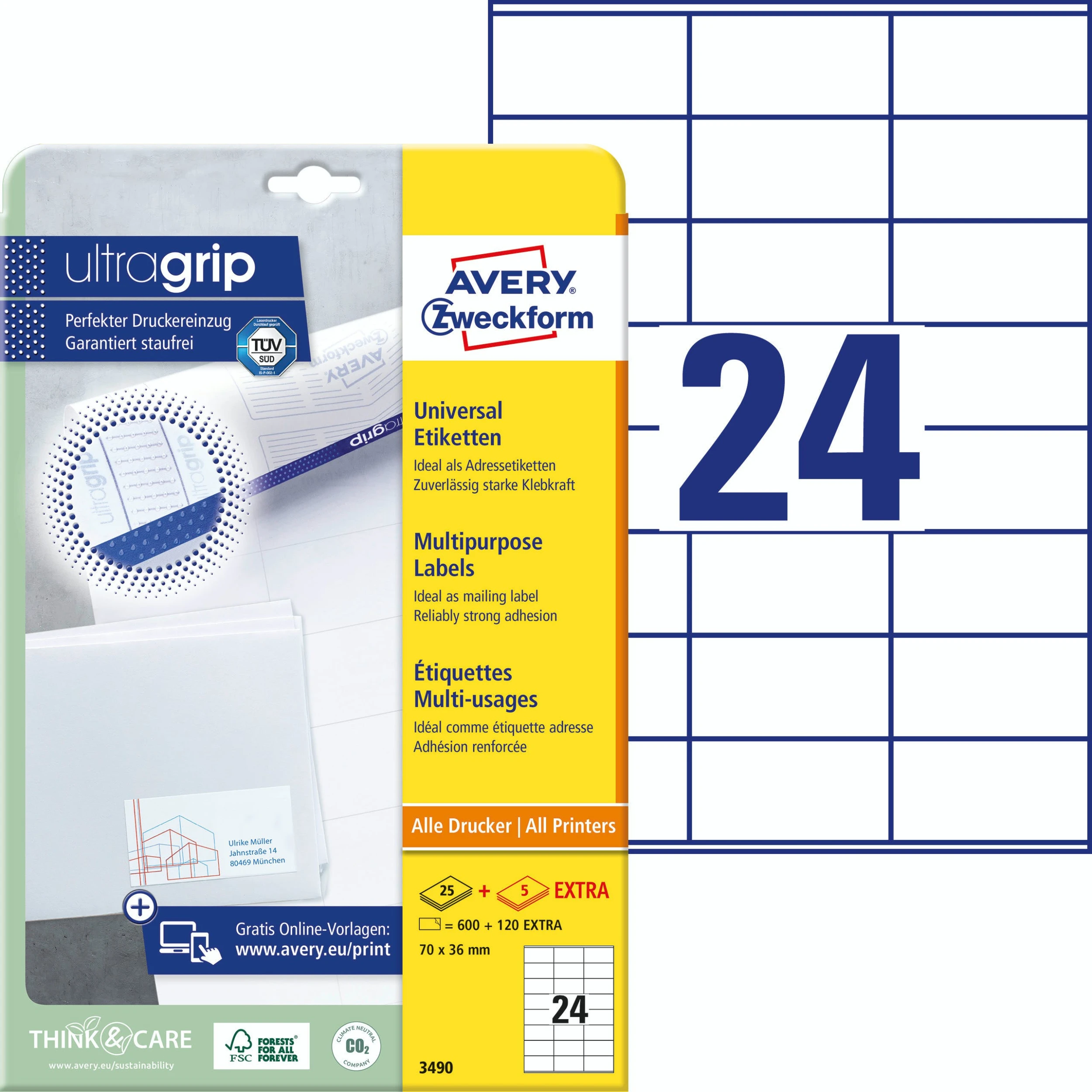 Die weißen, permanent haftenden Universal-Etiketten 3475 im Format 70 x 36 mm von AVERY ZWECKFORM eignen sich z.B. für Aktualisierungen oder für die Deutsche Post INTERNETMARKE und der Webstamp der Schweizer Post (2.400 Etiketten/Pack). Dank der innovativen ultragrip-Technologie können Sie sich auf einen ultrapräzisen Druckereinzug und absolut staufreien Druckerdurchlauf verlassen. Die QCT-Sicherheitskante verhindert Klebstoffablagerungen im Drucker. Druckerdurchlauf für Laser-Drucker getestet und bestätigt durch TÜV SÜD. Die Aufkleber kleben zuverlässig auf Papier, Karton, Glas und Kunststoffen und überzeugen mit einem klaren Druckbild ohne Verwischen. Geeignet für alle gängigen Laser- und Inkjet-Drucker. Das klimaneutrale Unternehmen Avery Zweckform verwendet schon seit 2014 ausschließlich Ökostrom/-gas. Das Obermaterial dieser chlorfrei gebleichten Etiketten wird zu 100% aus FSC®-zertifiziertem Papier aus nachhaltig bewirtschafteten Wäldern hergestellt.