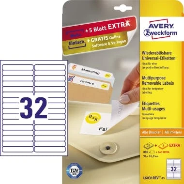 Avery Zweckform Etikett L6031REV-25 DIN A4 960 St./Pack. Die wiederablösbaren Universal-Etiketten von Avery Zweckform lassen sich mit allen gängigen Druckern und Kopierern bedrucken und garantieren einen staufreien Druckerdurchlauf. Diese Aufkleber bieten Ihnen für jeden Bedarf und Anwendungsbereich die passende Lösung und sind rückstandsfrei wiederablösbar. Kostenlose Software und Vorlagen finden Sie unter www.avery.eu/print.