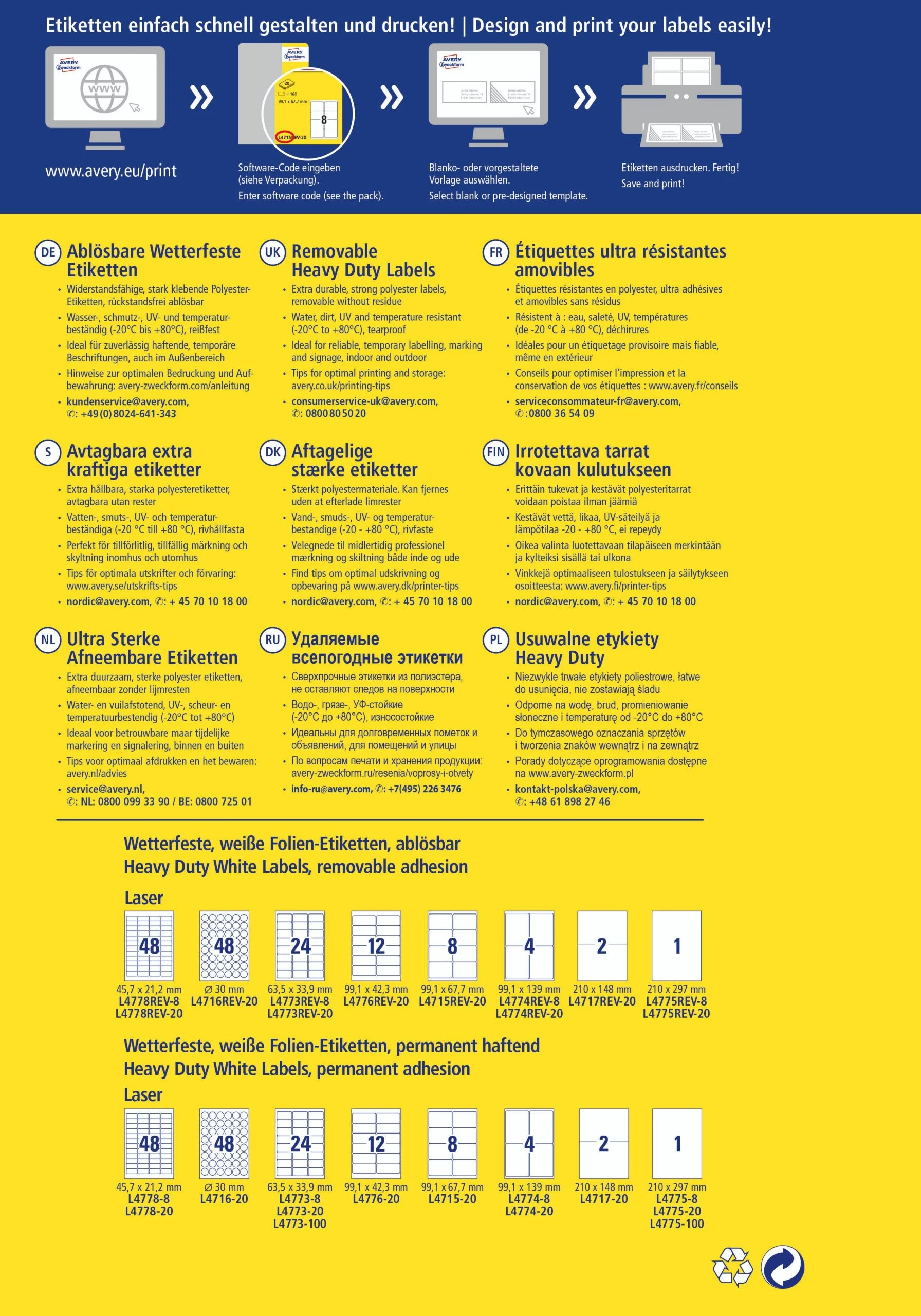 Die weißen, wetterfesten Etiketten L4717REV-20 im Format 210 x 148 mm für Laser-Drucker von AVERY ZWECKFORM zeichnen sich durch eine extreme Strapazierfähigkeit im Innen- und Außenbereich aus. 40 matt beschichtete Folien-Etiketten aus Polyester auf 20 Bogen. Die Aufkleber haften sehr stark und sind dabei ablösbar, ohne Kleberückstände zu hinterlassen und eignen sich dadurch besonders z.B. für die temporäre Kennzeichnung in Lager und Produktion, als Inventar- und Eigentums-Etiketten oder für Promotions und temporäre Produktbeschriftungen. Die reiß- und wasserfesten Folien-Etiketten sind deutlich strapazierfähiger als Papier-Etiketten, sie sind öl-, schmutz-, UV- und temperaturbeständig (-20° bis +80°C) und abwaschbar. Geeignet für alle gängigen Laser-Drucker. Das klimaneutrale Unternehmen Avery Zweckform verwendet schon seit 2014 ausschließlich Ökostrom/-gas. Die Etiketten aus PVC-freier Folie werden klimaneutral hergestellt, die Emissionen des Materials werden kompensiert.