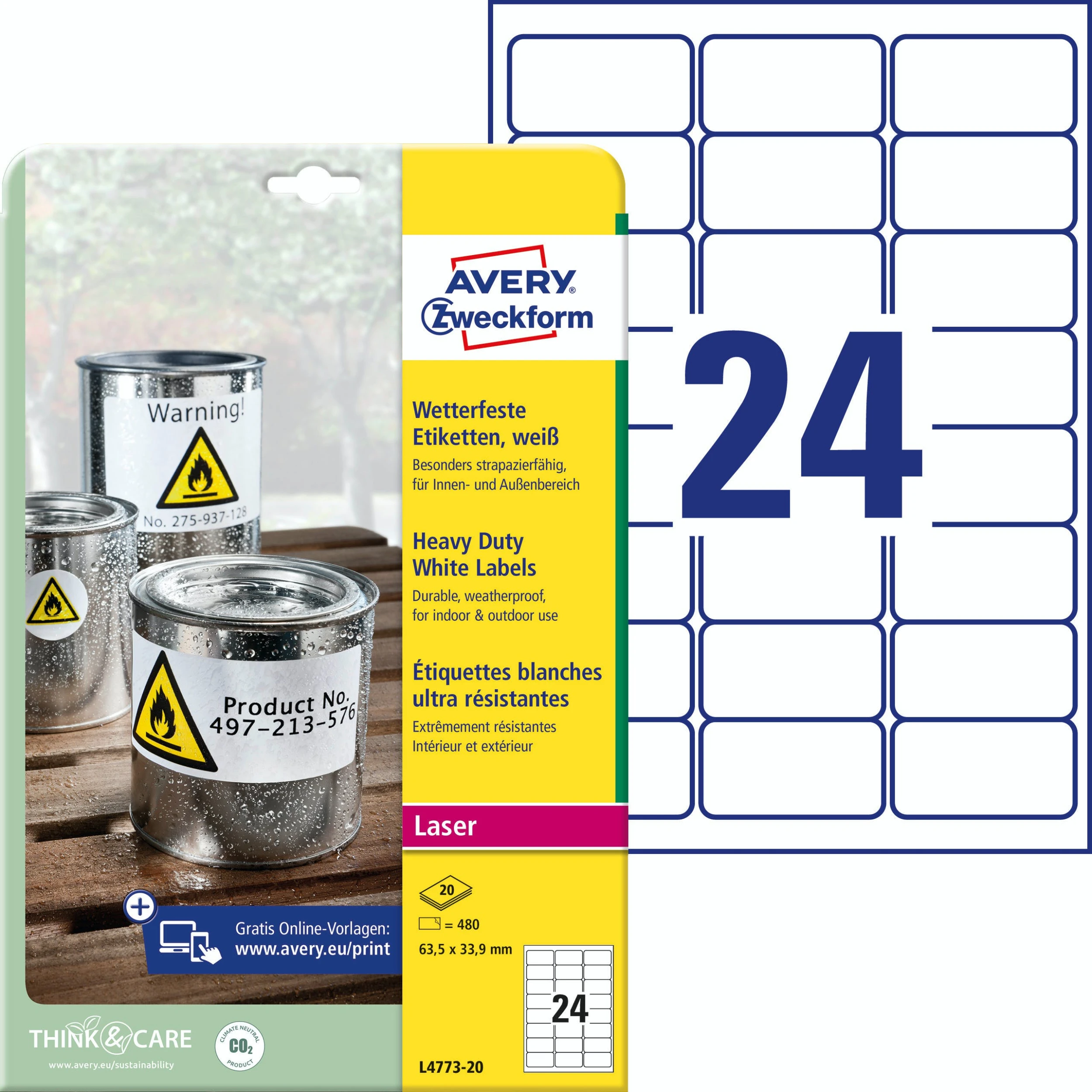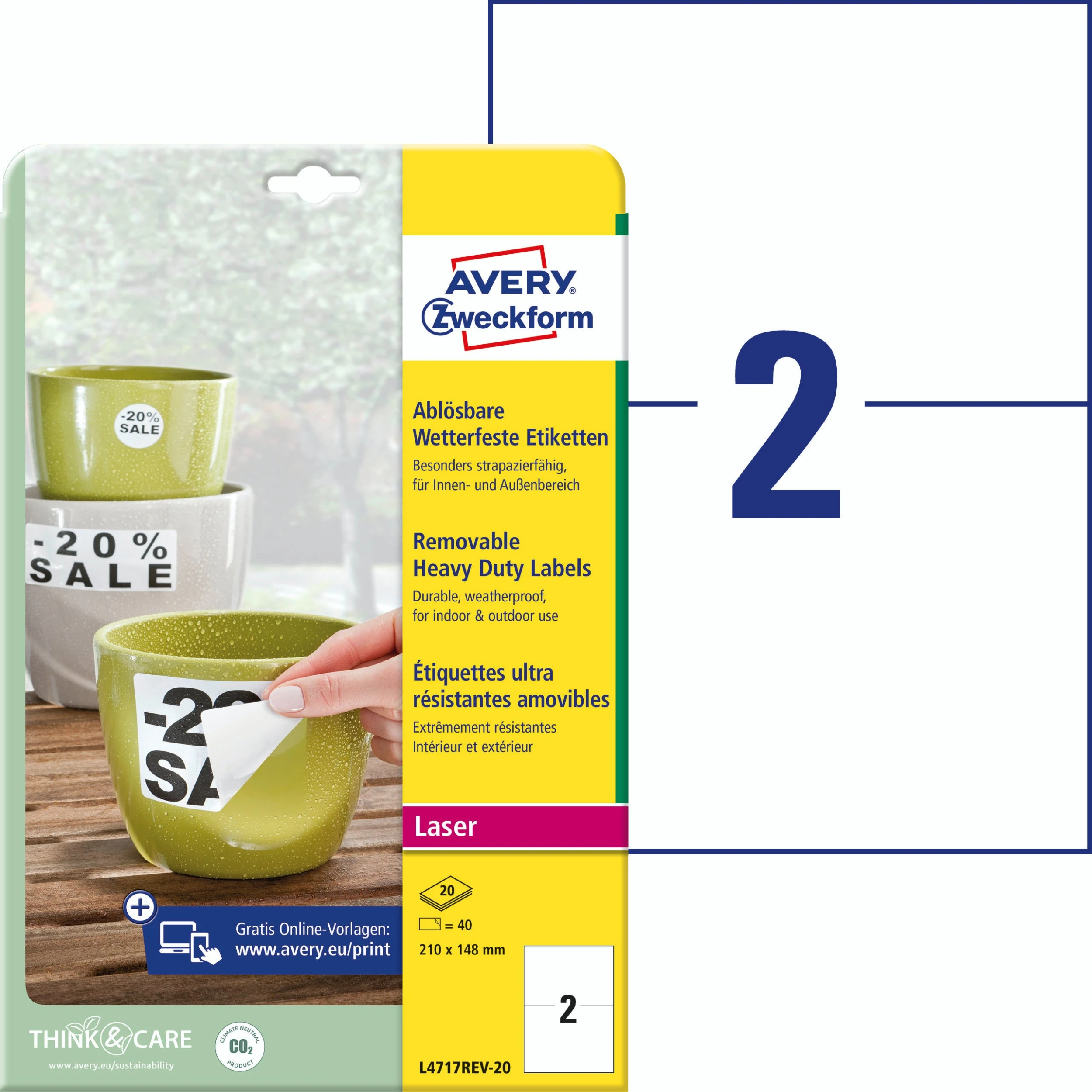 Die weißen, wetterfesten Etiketten L4719-20 im Format 105 x 148 mm für Laser-Drucker von AVERY ZWECKFORM zeichnen sich durch eine extreme Strapazierfähigkeit im Innen- und Außenbereich aus. 80 matt beschichtete Folien-Etiketten aus Polyester auf 20 Bogen. Durch die starke, permanente Haftung eignen sie sich besonders zur wetterfesten und dauerhaften Kennzeichnung. Die reiß- und wasserfesten Folien-Etiketten sind deutlich strapazierfähiger als Papier-Etiketten, öl-, schmutz-, UV- und temperaturbeständig (-20° bis +80°C), seewasserfest und abwaschbar. Geeignet für alle gängigen Laser-Drucker. Das klimaneutrale Unternehmen Avery Zweckform verwendet schon seit 2014 ausschließlich Ökostrom/-gas. Die Etiketten aus PVC-freier Folie werden klimaneutral hergestellt, die Emissionen des Materials werden kompensiert.