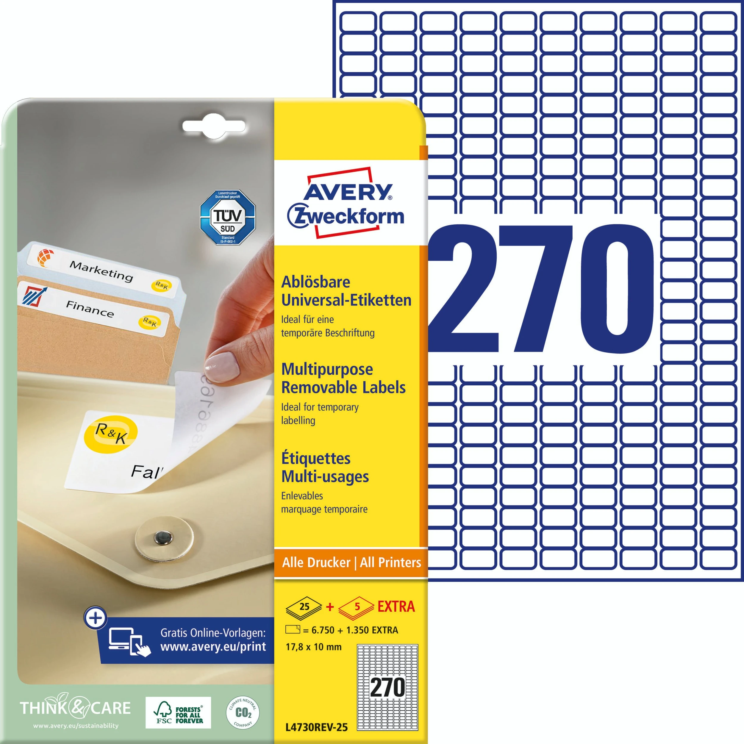 Mehr Inhalt: + 5 Blatt EXTRA! Die weißen, ablösbaren Universal-Etiketten L4735REV-25 im Format 210 x 297 mm von AVERY ZWECKFORM eignen sich z.B. zum Selbstausschneiden individueller Größen (25 Etiketten/Packung + 5 Etiketten EXTRA). Die Etiketten haften sicher auf den verschiedensten Oberflächen und sind ablösbar, ohne Klebstoffrückstände zu hinterlassen. Sie können sich auf einen absolut staufreien Druckerdurchlauf ohne Klebstoffablagerungen im Drucker verlassen. Druckerdurchlauf für Laser-Drucker getestet und bestätigt durch den TÜV SÜD. Universal-Etiketten für jeden Bedarf mit einem gestochen klaren Druckbild ohne Verwischen – durch beste Tonerverankerung. Geeignet für alle gängigen Laser- und Inkjet-Drucker. Das klimaneutrale Unternehmen Avery Zweckform verwendet schon seit 2014 ausschließlich Ökostrom/-gas. Das Obermaterial dieser chlorfrei gebleichten Etiketten wird zu 100% aus FSC®-zertifiziertem Papier aus nachhaltig bewirtschafteten Wäldern hergestellt.