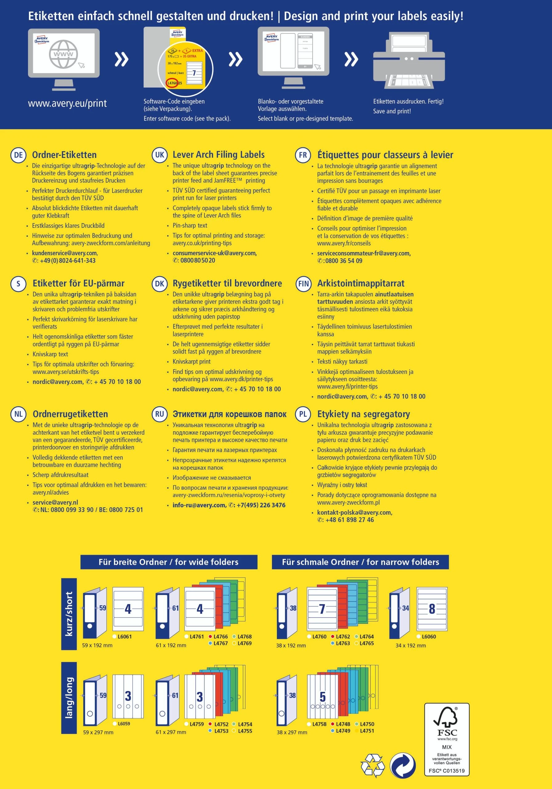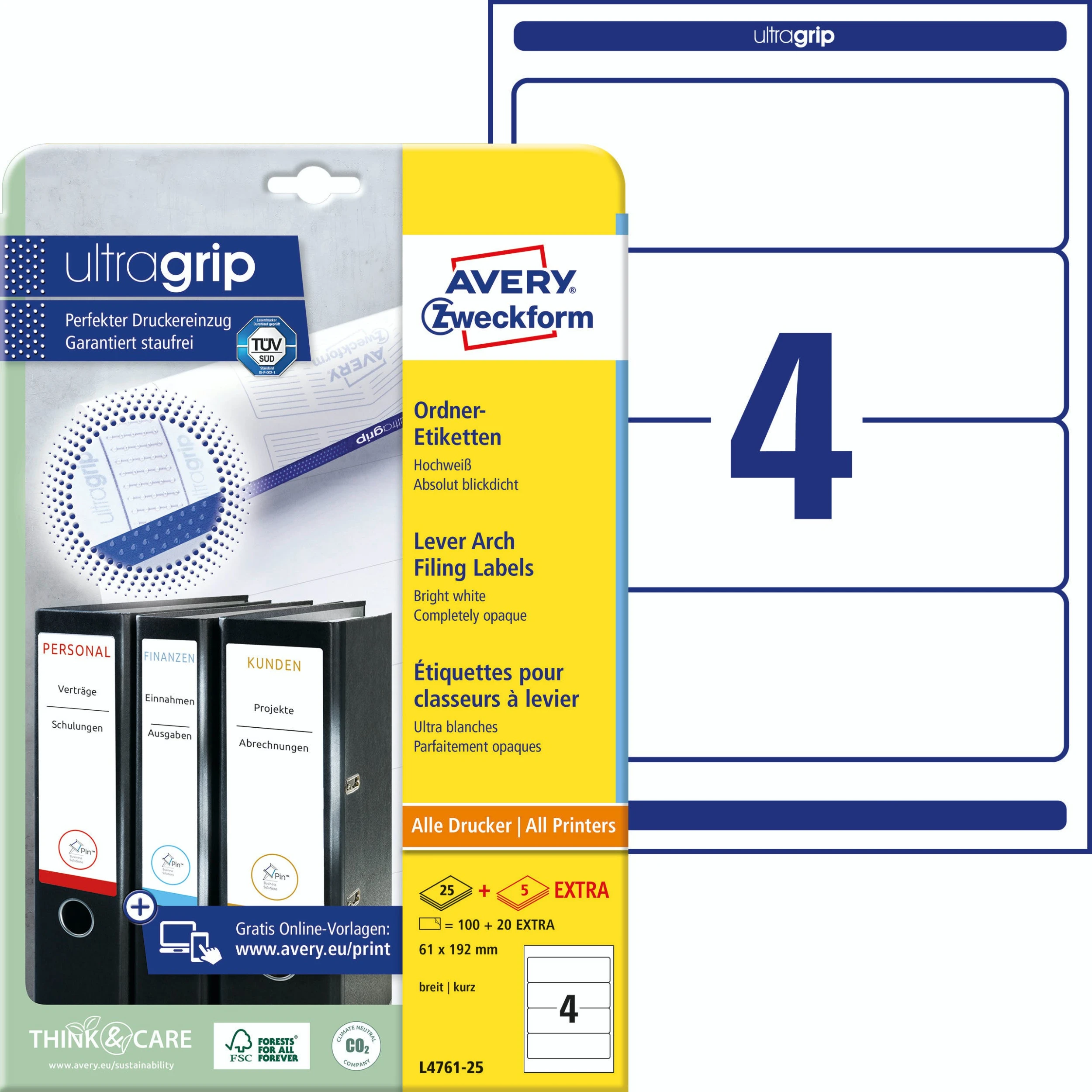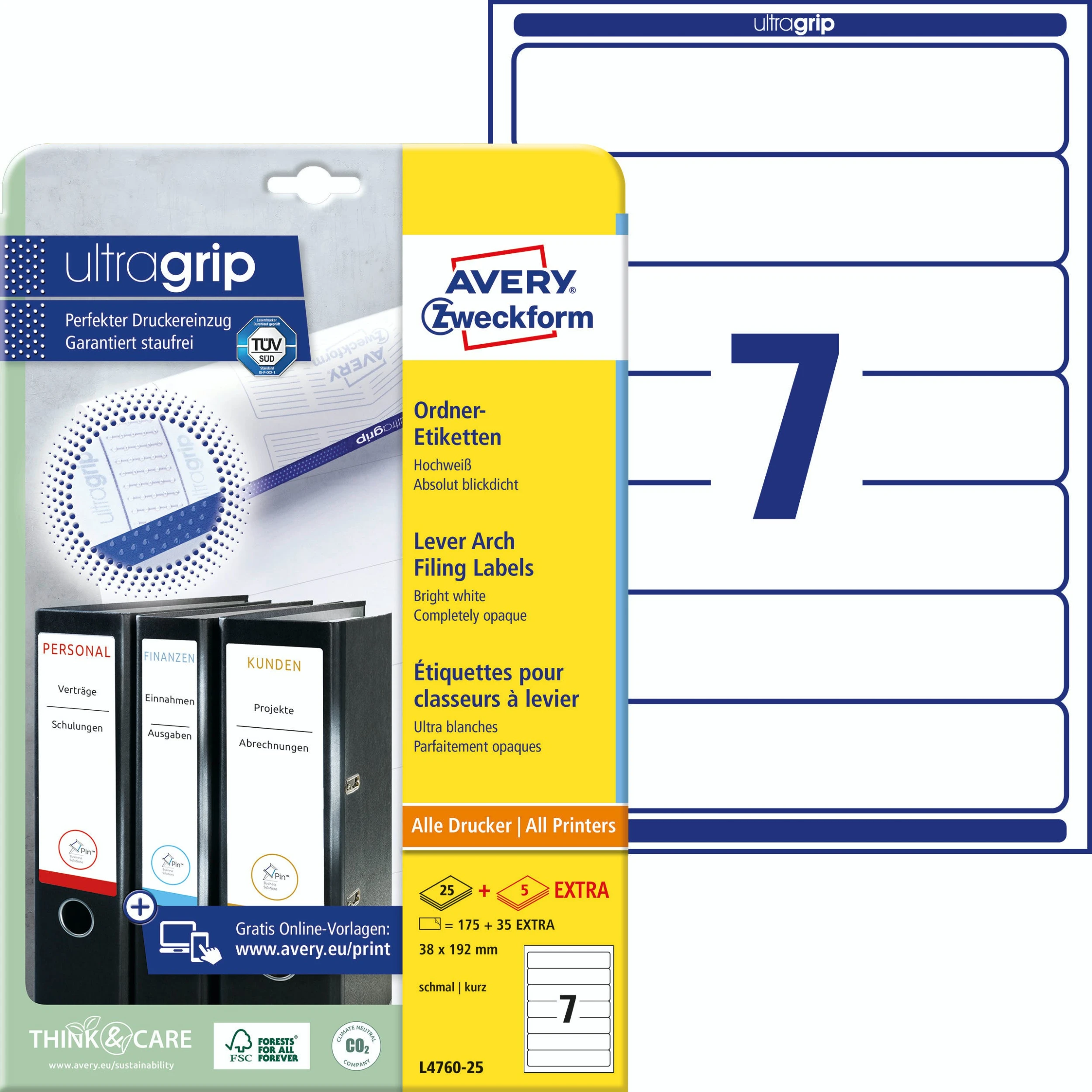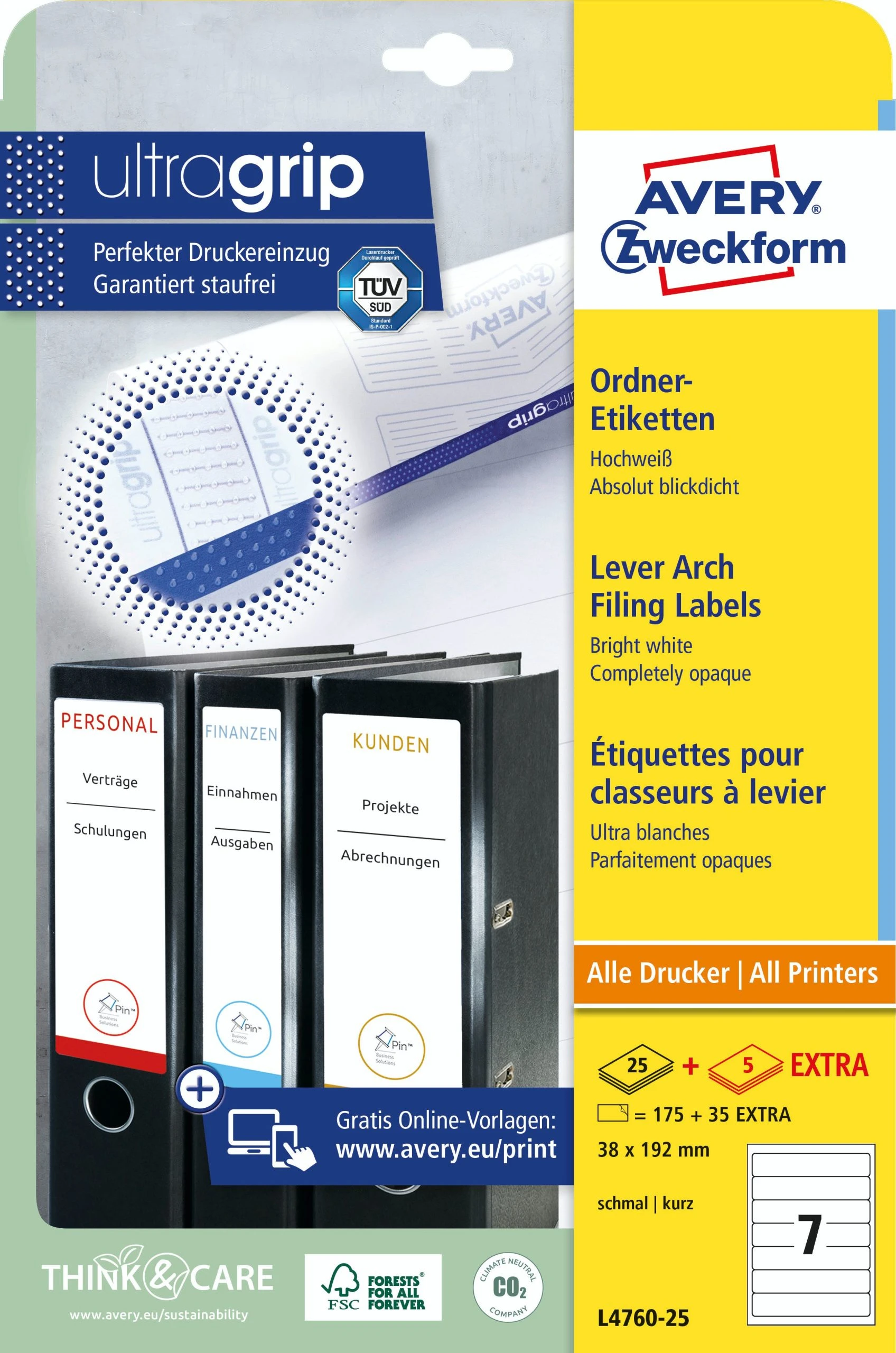 Die weißen, selbstklebenden Ordner-Etiketten L4760-25 im Format 38 x 192 mm (schmal/kurz) von AVERY ZWECKFORM kleben dauerhaft sicher auf allen gängigen schmalen Standard-Ordnern wie z.B. Leitz, Elba, Esselte, Mehle, Herlitz und Bene. Dank der innovativen ultragrip-Technologie können Sie sich auf einen ultrapräzisen Druckereinzug und absolut staufreien Druckerdurchlauf verlassen. Problemloser Druckerdurchlauf für Laser-Drucker bestätigt durch den TÜV SÜD. Die 175 Ordner-Etiketten + 35 EXTRA. Die Etiketten sind besonders blickdicht und decken so alte Beschriftungen und Etiketten zuverlässig und sauber ab. Geeignet für alle gängigen Laser- und Inkjet-Drucker. Das klimaneutrale Unternehmen Avery Zweckform verwendet schon seit 2014 ausschließlich Ökostrom/-gas. Das Obermaterial dieser chlorfrei gebleichten Etiketten wird zu 100% aus FSC®-zertifiziertem Papier aus nachhaltig bewirtschafteten Wäldern hergestellt.