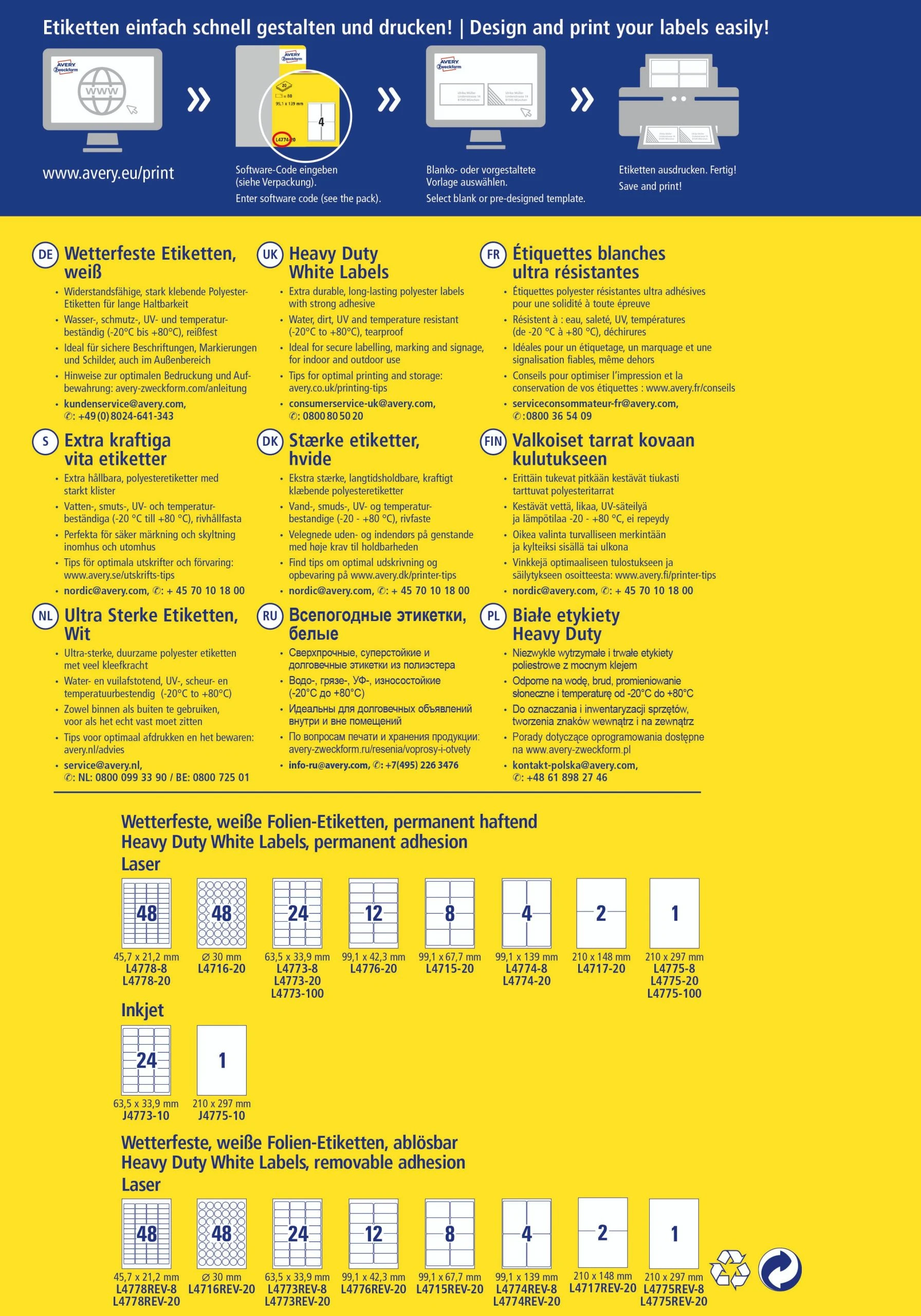 Die weißen, wetterfesten Etiketten L4776-20 im Format 99,1 x 42,3 mm für Laser-Drucker von AVERY ZWECKFORM zeichnen sich durch eine extreme Strapazierfähigkeit im Innen- und Außenbereich aus. 240 matt beschichtete Folien-Etiketten aus Polyester auf 20 Bogen. Durch die starke, permanente Haftung eignen sie sich besonders zur wetterfesten und dauerhaften Kennzeichnung. Die reiß- und wasserfesten Folien-Etiketten sind deutlich strapazierfähiger als Papier-Etiketten, öl-, schmutz-, UV- und temperaturbeständig (-20° bis +80°C), seewasserfest und abwaschbar. Geeignet für alle gängigen Laser-Drucker. Das klimaneutrale Unternehmen Avery Zweckform verwendet schon seit 2014 ausschließlich Ökostrom/-gas. Die Etiketten aus PVC-freier Folie werden klimaneutral hergestellt, die Emissionen des Materials werden kompensiert.