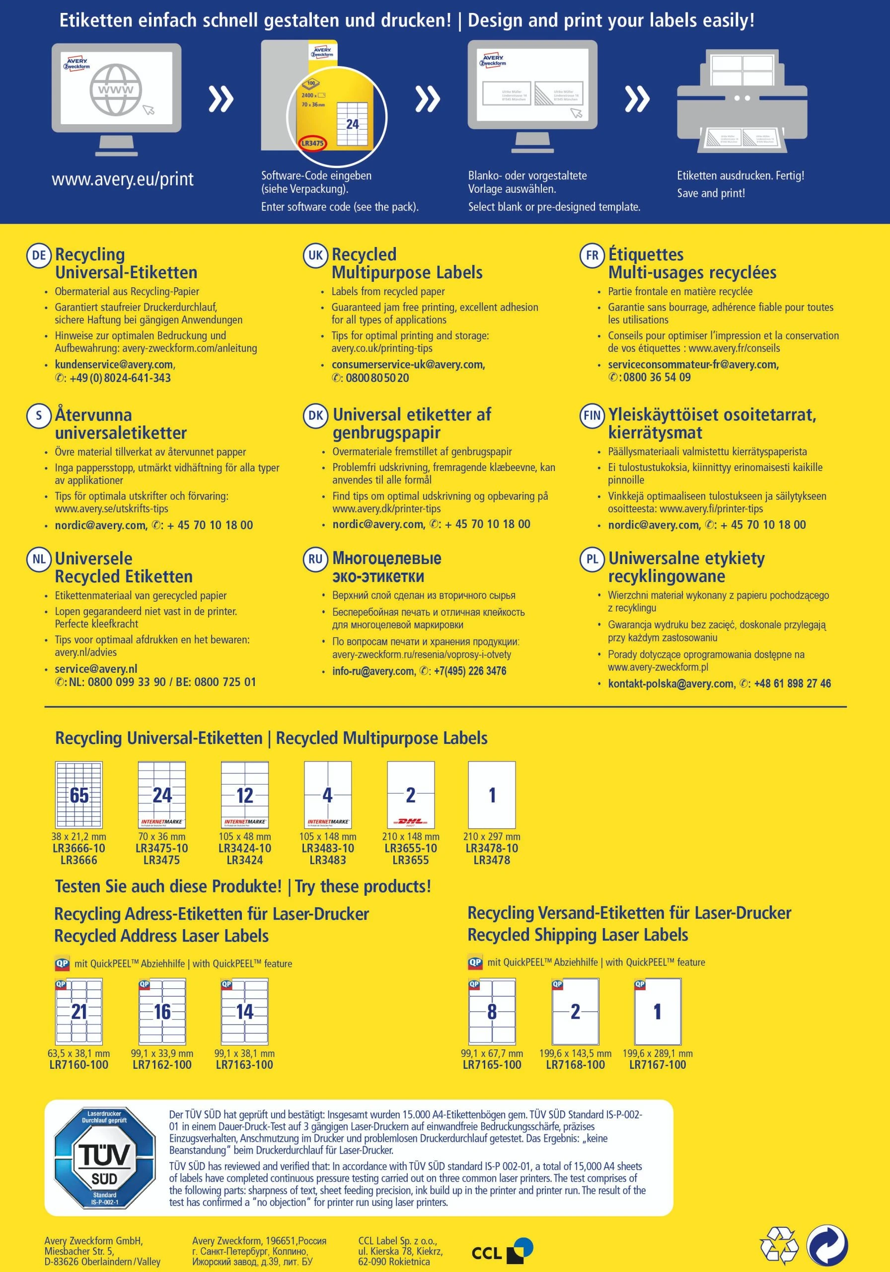 Die naturweißen Recycling-Etiketten LR3475 im Format 70 x 36 mm von AVERY ZWECKFORM eignen sich z.B. für Akualisierungen von Werbemitteln oder für die Deutsche Post INTERNETMARKE (2.400 Etiketten/Packung). Das Etiketten-Obermaterial besteht aus 100% chlorfrei gebleichtem Altpapier, zertifiziert mit dem Blauen Engel, der umweltfreundliche Klebstoff ist wasserbasiert. Bei der Herstellung entstehen weniger Emissionen, die Produktionsabfälle werden komplett wiederverwertet. Das klimaneutrale Unternehmen Avery Zweckform verwendet schon seit 2014 ausschließlich Ökostrom/-gas. Made in Germany. Diese Aufkleber lassen sich garantiert staufrei mit allen gängigen Laser- und Inkjet-Druckern bedrucken. Druckerdurchlauf für Laser-Drucker getestet und bestätigt durch TÜV SÜD.