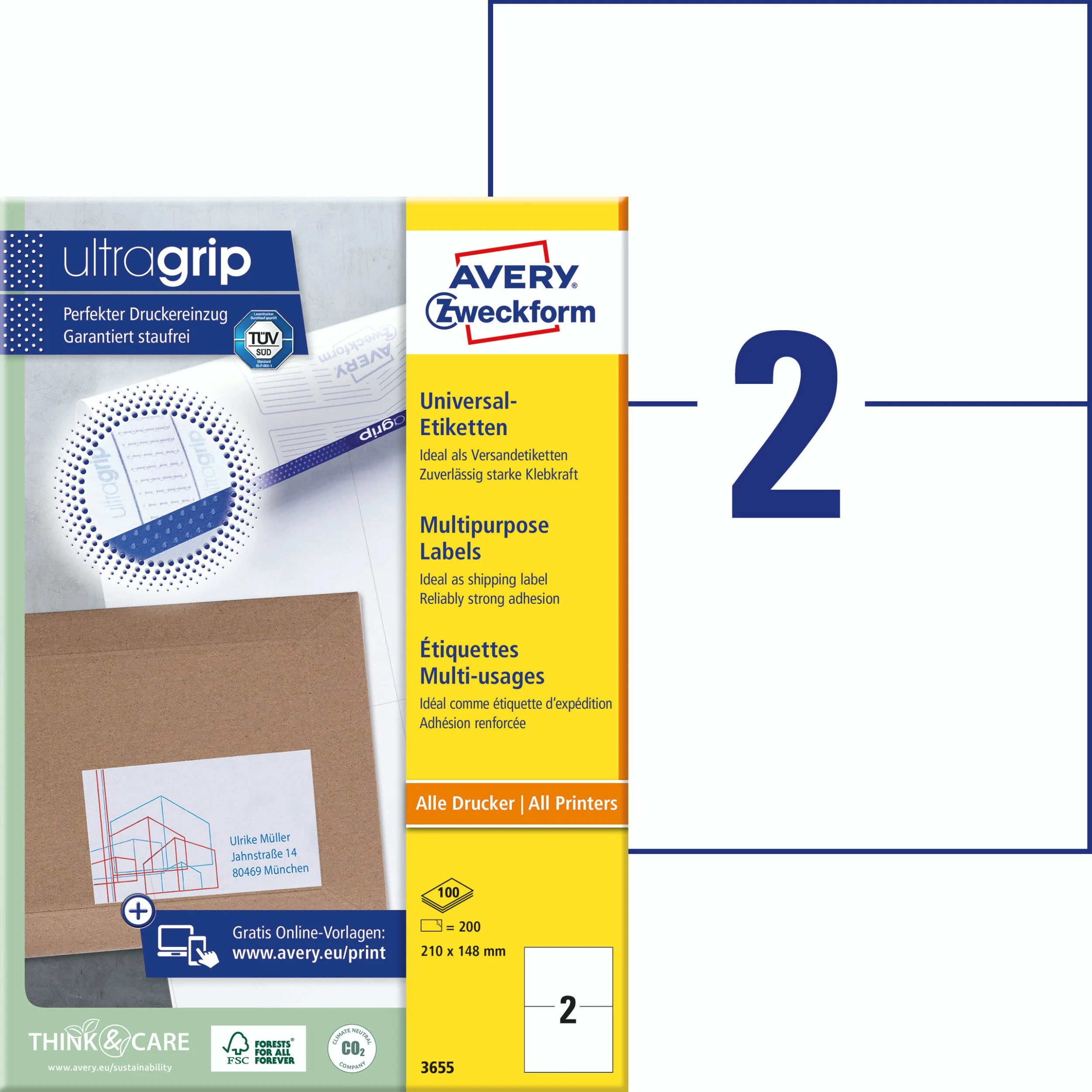 Die naturweißen Recycling-Etiketten LR3655 im Format 210 x 148 mm von AVERY ZWECKFORM eignen sich z.B. als Inhaltsetikett für Umzugskartons (200 Etiketten/Packung). Das Etiketten-Obermaterial besteht aus 100% chlorfrei gebleichtem Altpapier, zertifiziert mit dem Blauen Engel, der umweltfreundliche Klebstoff ist wasserbasiert. Bei der Herstellung entstehen weniger Emissionen, die Produktionsabfälle werden komplett wiederverwertet. Das klimaneutrale Unternehmen Avery Zweckform verwendet schon seit 2014 ausschließlich Ökostrom/-gas. Made in Germany. Diese Aufkleber lassen sich garantiert staufrei mit allen gängigen Laser- und Inkjet-Druckern bedrucken. Druckerdurchlauf für Laser-Drucker getestet und bestätigt durch TÜV SÜD.