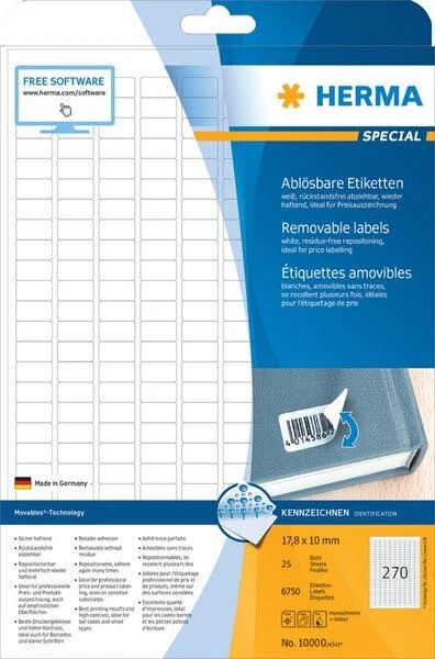 Kennzeichnungsetiketten 17,8x10mm ws 25 Blatt=6750 Etiketten VE = 1 Packung = 25 Blatt Rückstandsfrei abziehar wieder klebend f. Laser-,Inkjet-,Matrixdrucker u. Kopierer