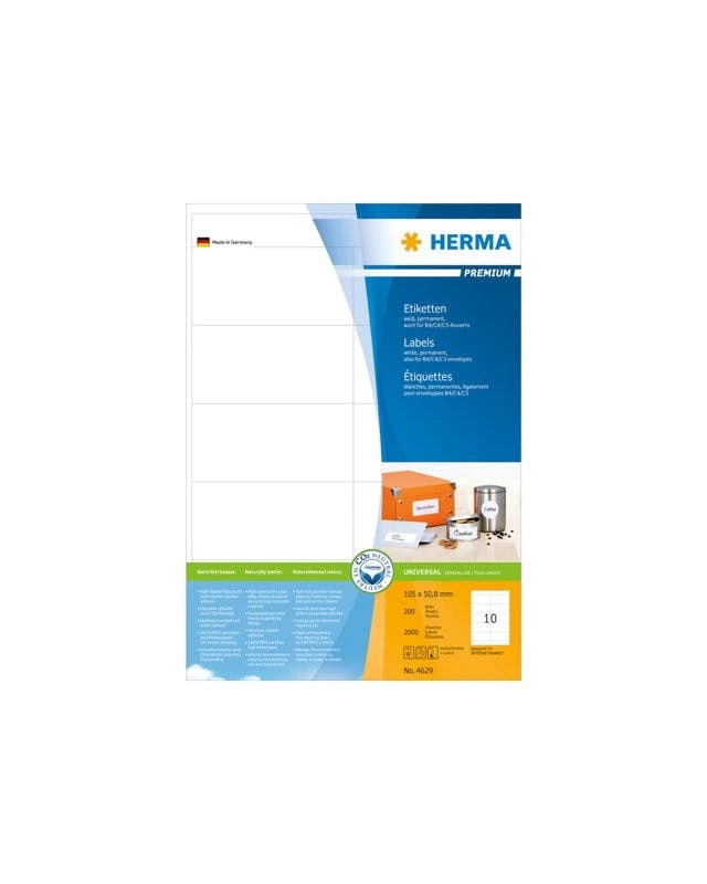 HERMA Etikett PREMIUM 4629 105×50,8mm weiß 2.000 St./Pack. Garantiert staufrei und high-speed-fähig durch extra starken Spezialverbund. Hoher Weißegrad und gleichmäßige Oberfläche für beste Druckergebnisse. Kostenlose Softwarelösungen: www.herma.de/software. Störungsfreie Verarbeitung durch Rundum-Sicherheitskante und optimale Planlage. Geeignet für INTERNETMARKE (D) mit Empfängeradresse.