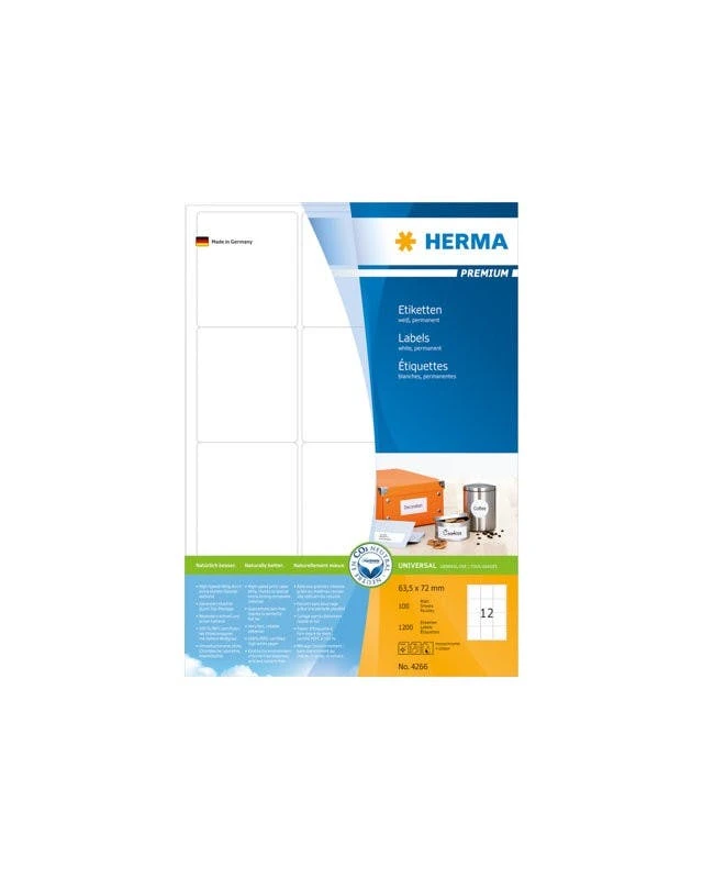 Herma PREMIUM Etiketten 63,5 X 72 Mm, 1.200 Etiketten, Weiß, Matt, Permanent Haftend, Blattformat: DIN A4