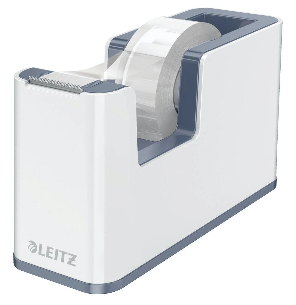 Stabiler und schwerer Tischabroller für bequeme Bedienung mit nur einer Hand. Mit Gummifüssen. Sauberes Abtrennen des Klebebandes durch gezackt geschliffene Klinge.