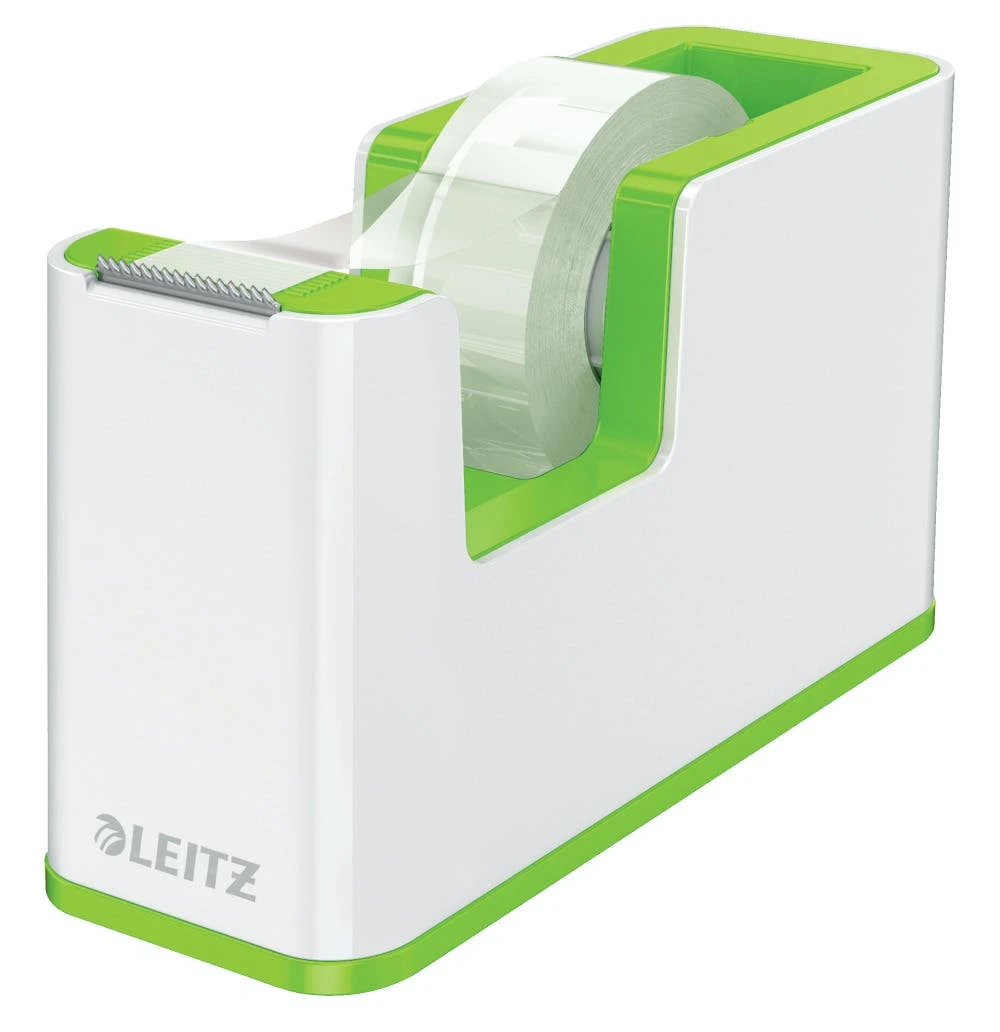Leitz Klebeband-Abroller WOW, Duo Colour. Stabiler und schwerer Tischabroller für rutschfesten Stand und bequeme Bedienung mit nur einer Hand. Mit Gummifüssen. Sauberes Abtrennen des Klebebandes durch gezackt geschliffene Klinge. Universal einsetzbar, für Klebefilmrollen bis 19 mm x 33 m und einem Kerndurchmesser von 25 mm. Schnelles und einfaches Rollenwechseln. Hochglänzend. Inklusive transparentem, kristallklarem Klebeband. Material: Polystyrol (PS). Format: 51 x 76 x 126 mm. Farbe: blau metallic