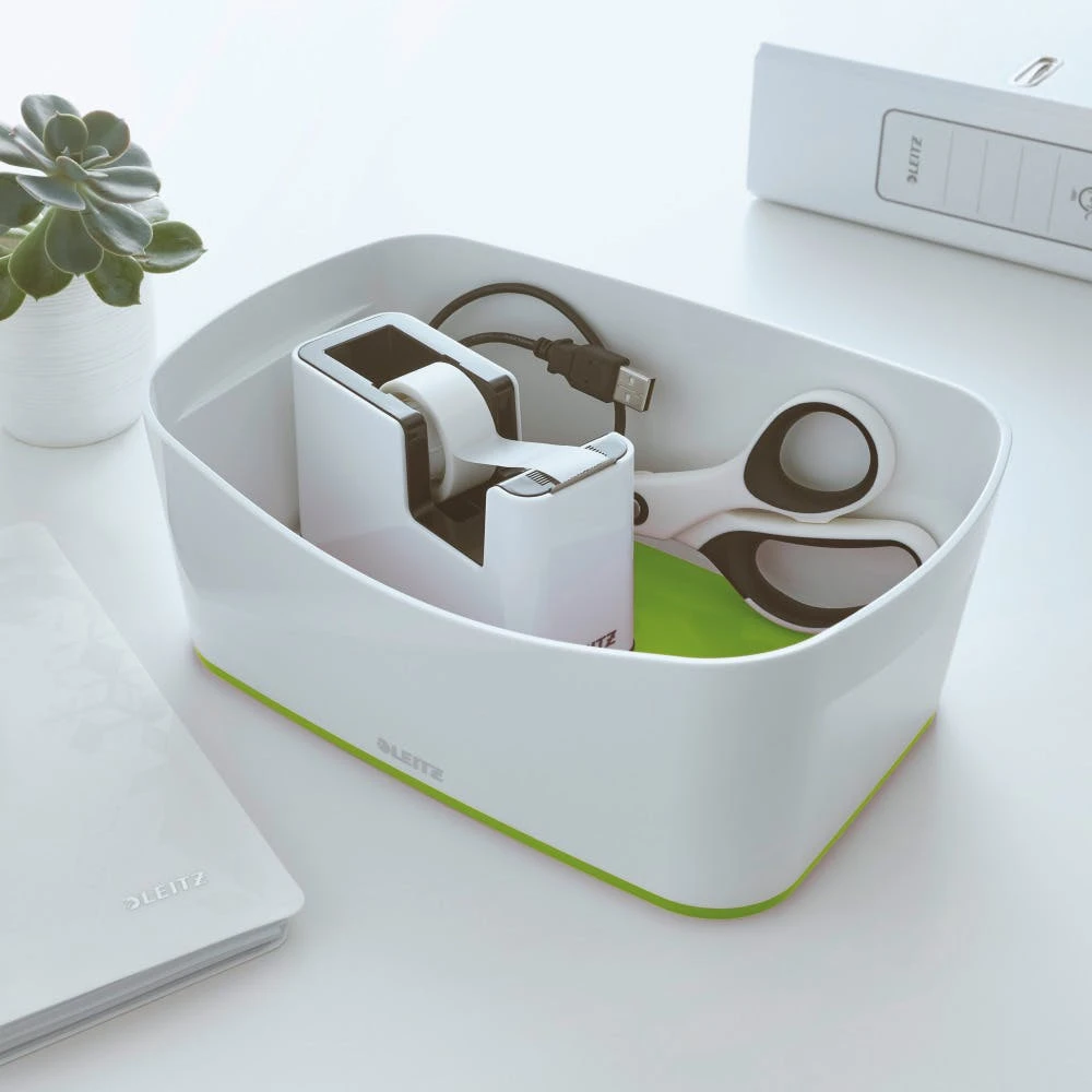 Stabiler und schwerer Tischabroller für bequeme Bedienung mit nur einer Hand. Mit Gummifüssen. Sauberes Abtrennen des Klebebandes durch gezackt geschliffene Klinge.