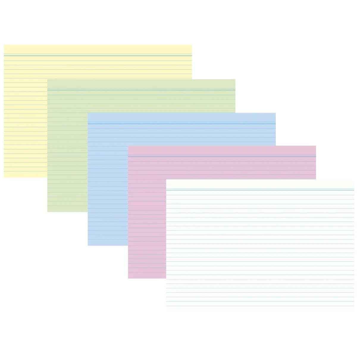 Karteikarte Mehrzweckkarte liniert. Werkstoff: holzfreies Papier. Farbe der Kopflinie: blau. Format der Karte: DIN A6. Ausführung der Lineatur: liniert 7mm. Farbe: farbig sortiert – je 20 Stück in weiß, gelb, rosa, blau, grün. Art der Verpackung und Inhalt: 100 Stück.