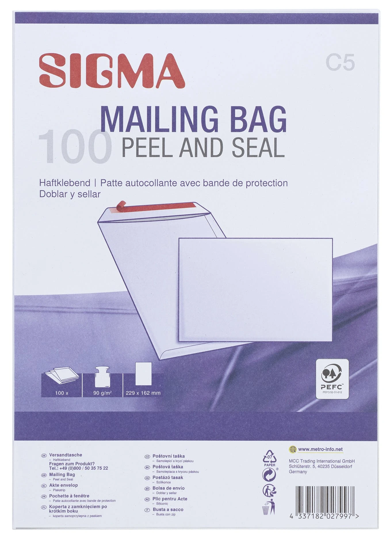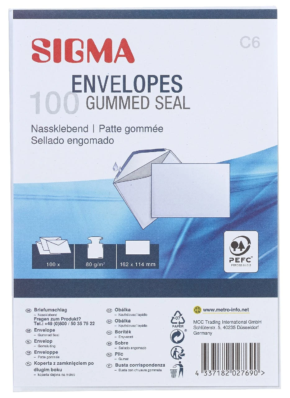 Der weiße Briefumschlag von SIGMA hat die Maße 16,2 x 11,4 cm, 80g/㎡. Jede Verpackungseinheit besteht aus 100 Stück.