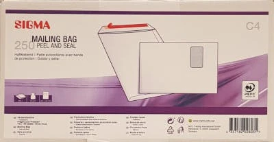 Die Sigma Versandtaschen (weiß), DIN C4, haben ein Papiergewicht von 90 g/m². Jede Verpackungseinheit besteht aus 250 Versandtaschen mit Fenster.